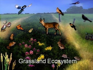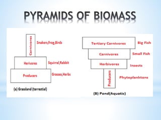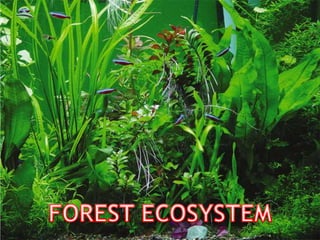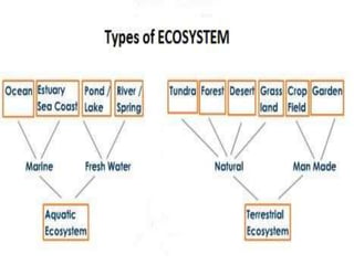 1. The document provides information about various types of ecosystems including terrestrial, aquatic, forest, grassland, desert, pond, lake, marine and ocean ecosystems.