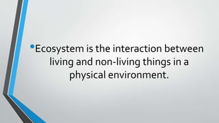An ecosystem is defined as the interaction between living and non-living things in a physical environment. There are six main types of ecosystems: marine, grassland, tropical rainforest, desert, tundra, and temperate forests. Each ecosystem is characterized by different biotic and abiotic factors that support various plant and animal life.