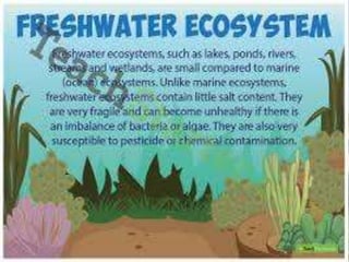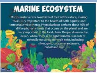 An ecosystem is a biological community of interacting organisms and their physical environment. It can be of any size but usually encompasses specific, limited spaces. There are three main types of ecosystems: freshwater, terrestrial, and ocean. Freshwater ecosystems include ponds and rivers. Terrestrial ecosystems include rainforests, tundra, deserts, taiga, forests, and grasslands. Ocean ecosystems include shallow waters, deep waters, warm waters, and cold waters. Ecosystems are complex networks of interactions between organisms and their environments.