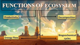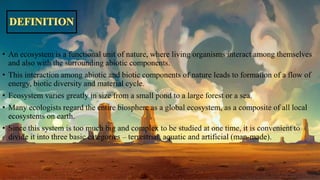 This document discusses various types of ecosystems and their components. It describes three main types of ecosystems - terrestrial, aquatic, and artificial ecosystems. It also explains key abiotic factors like temperature, water, light and soil that influence ecosystems. The document outlines important biotic components of ecosystems including producers, consumers, and decomposers. It provides details about ecosystem functions like primary and secondary productivity, decomposition, energy flow, and nutrient cycling.