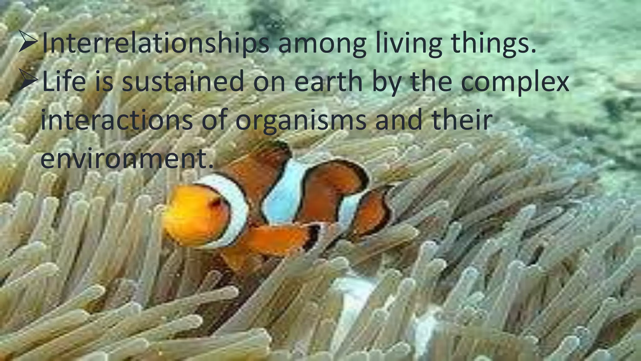 1) Life on Earth exists as a complex web of interactions between organisms and their environments. Organisms interact with each other through relationships like predation, competition, and mutualism.