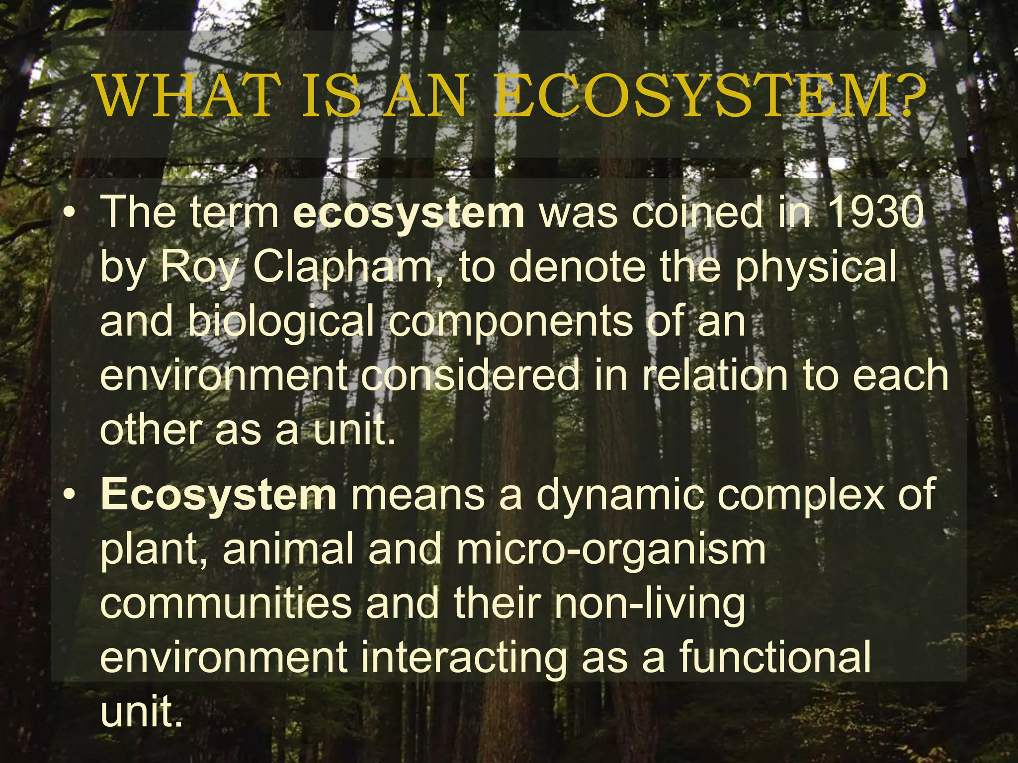 This document defines key concepts in ecosystems, including their structure and functions. It describes how ecosystems consist of biotic and abiotic components that interact, with energy flowing through the system and biogeochemical cycles circulating nutrients. It outlines the major groups - producers, primary and secondary consumers, decomposers - and their roles. Food chains and webs demonstrate how energy transfers between organisms, while ecological pyramids and succession illustrate how communities change over time.