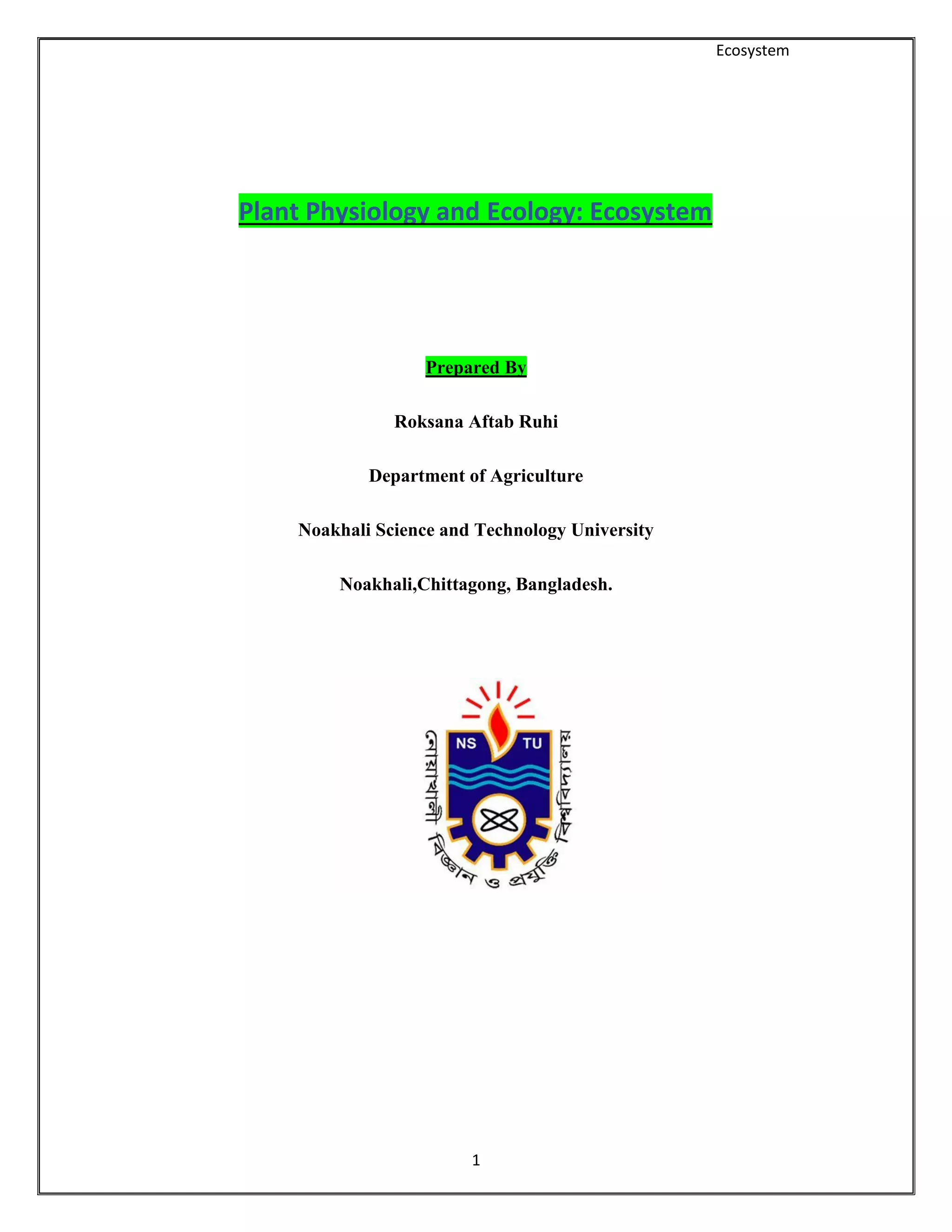 This document provides an introduction to ecosystems. It defines an ecosystem as all the living and non-living things interacting in a given area, with organisms depending on each other and the physical environment. Ecosystems have biotic components like plants, animals and microbes, and abiotic components like air, soil, water and nutrients. The key interactions between living and non-living factors maintain balances like the carbon and nitrogen cycles. Ecosystems can be classified by their environment, such as aquatic ecosystems including wetlands, coral reefs and mangroves, and terrestrial ecosystems like forests and grasslands.