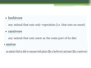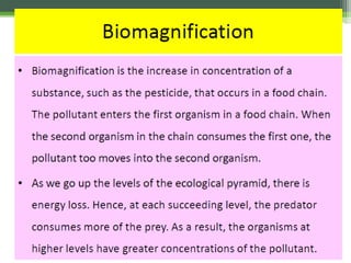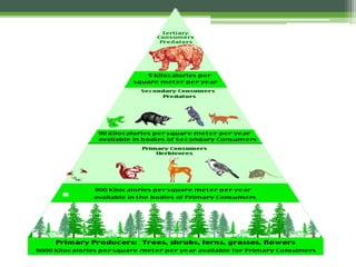The document discusses ecosystems, including their structure, functions, and examples. It defines an ecosystem as a natural unit consisting of living and non-living components that interact. The key components are producers, consumers, and decomposers. Food chains and webs show energy transfer between trophic levels, which is typically only 10% efficient. Ecosystems include both natural and man-made examples like forests, grasslands, ponds, oceans, and agricultural fields. Ecological pyramids illustrate the biomass and numbers at each trophic level. Succession over time leads to a stable climax community.