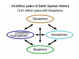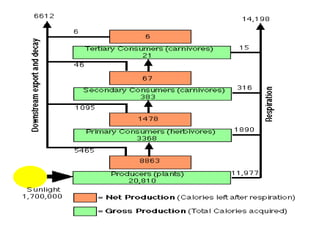 The document defines ecology as the scientific study of the interaction between living organisms and their environment. It discusses key concepts in ecology like ecosystems, biotic and abiotic components, energy flow, nutrient cycling, and trophic structure. Some key types of ecosystems mentioned are forests, grasslands, deserts, aquatic, urban, and agricultural ecosystems.
