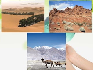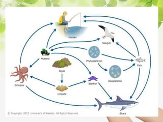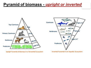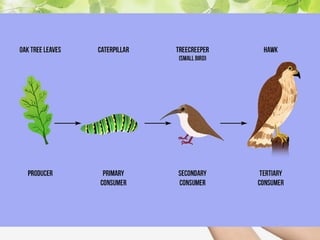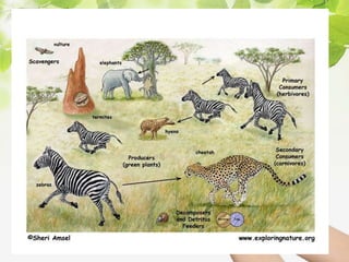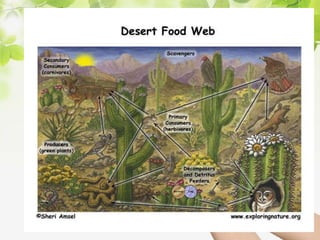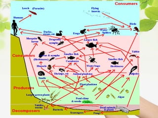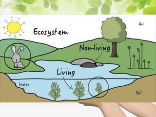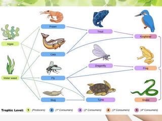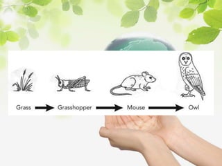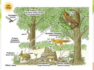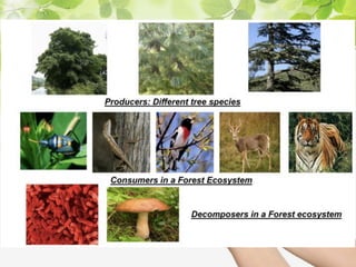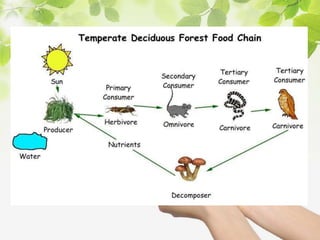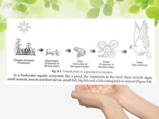 The document discusses the concept of ecology, introduced by Haeckel in 1869, and its definition as the study of interactions between organisms and their environment, encompassing both biotic and abiotic components. It defines ecosystems, elaborates on their structure and function, types (natural and man-made), and the processes of energy flow and nutrient cycling, including food chains and webs. Lastly, the document highlights specific ecosystems like forests, grasslands, and deserts, emphasizing their characteristics, components, and ecological significance.