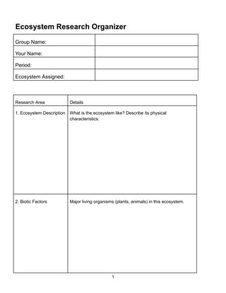 This document outlines a research project on ecosystems, detailing aspects such as ecosystem description, biotic and abiotic factors, global location, dominant species, habitat challenges, and human impact. It emphasizes the use of reliable sources and provides guidelines for creating a Google Slide presentation with specific formatting requirements and a due date of August 19th. The project encourages exploration of marine ecosystems and includes tips for successful completion.