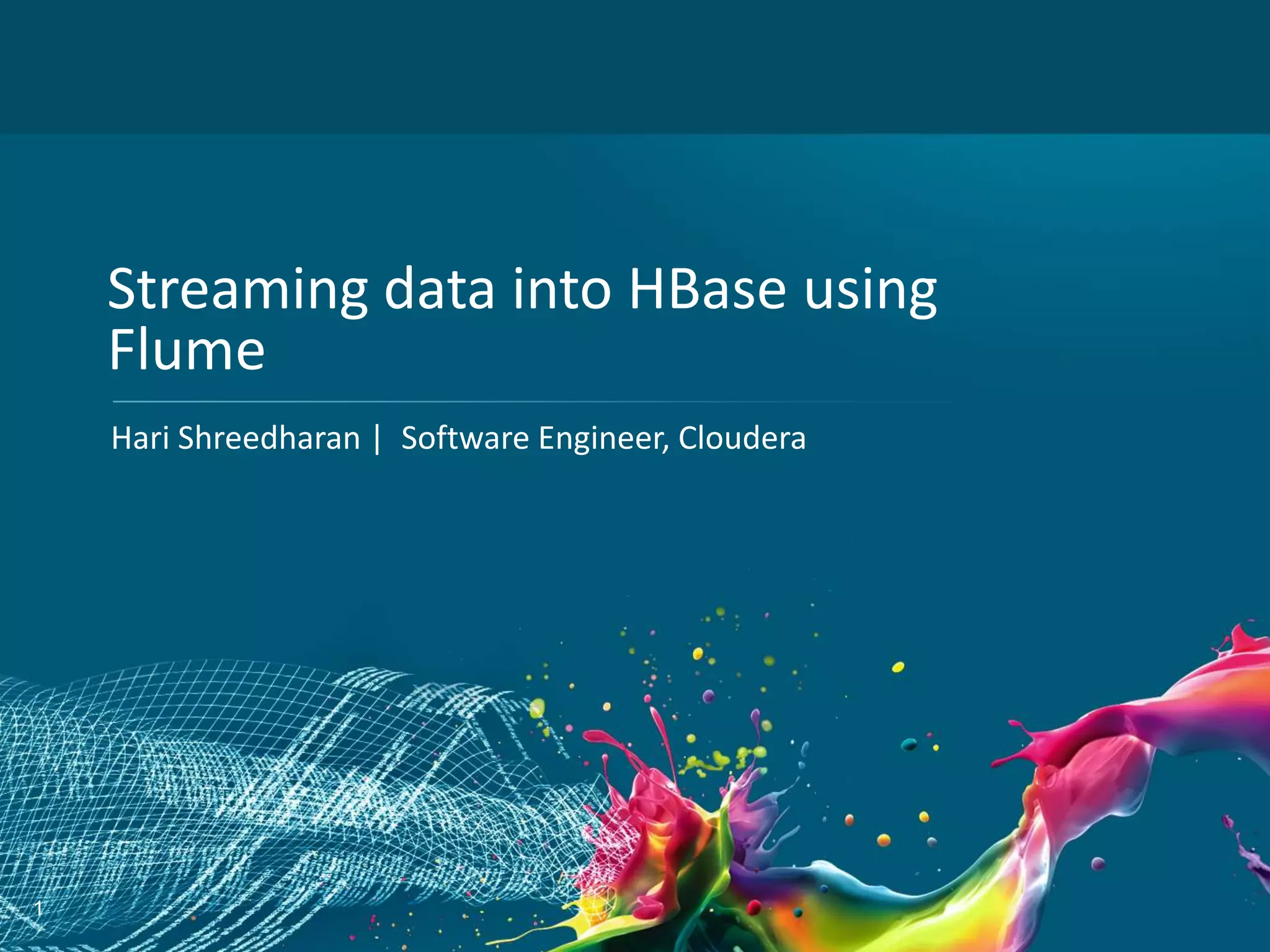 This document discusses using Apache Flume to stream data into Apache HBase. It describes how Flume provides a scalable and flexible way to collect and transport log and event data to HBase. Specifically, it covers the HBase sink plugin for Flume, which allows routing Flume events to HBase tables. It notes that while the initial HBase sink had limitations, the asynchronous HBase sink improved performance by fully utilizing the HBase cluster. Overall, the document presents Flume as a viable alternative to directly writing to HBase and provides flexibility to change schemas without code changes.