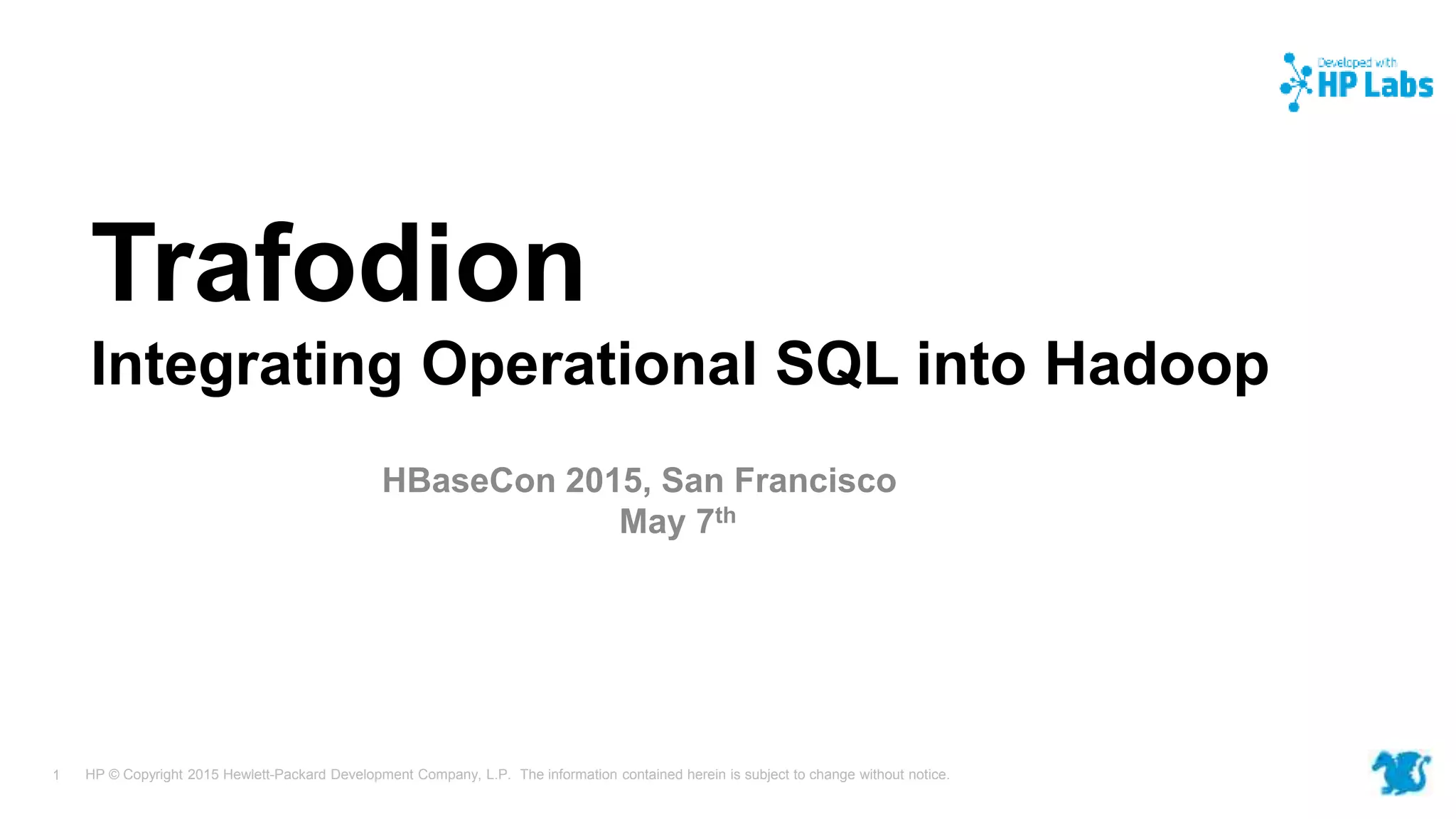 Trafodion is an open-source relational database management system designed for Hadoop, facilitating operational SQL integration with features like full ACID transaction management and ANSI SQL support. It supports complex data types and high concurrency, enabling efficient handling of operational, historical, and analytical workloads. The architecture leverages HBase for scalability and reliability, with mechanisms for distributed transaction management and robust data integrity.