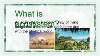 An ecosystem is a community of living things that interact with each other and their physical environment. It can include plants, animals, fungi, bacteria and other organisms as well as non-living elements like weather and landscape. Ecosystems provide environments for organisms to live and they maintain balance through complex interconnections between living and nonliving components. Examples of ecosystems discussed include deserts, tundra, rainforests, oceans, savannas and swamps.