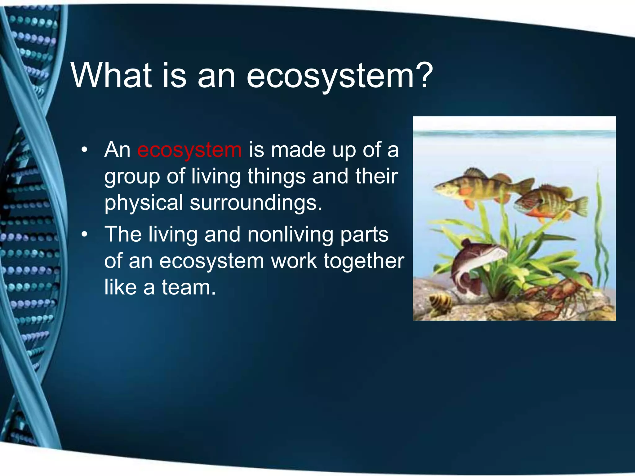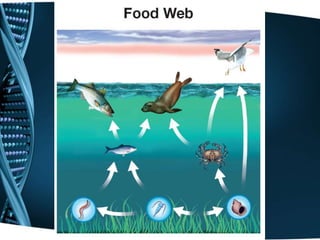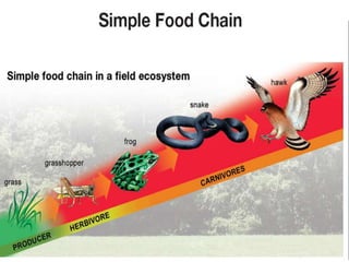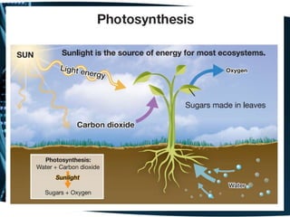 An ecosystem is made up of living things and their physical environment that interact and depend on each other. Sunlight provides the initial energy that plants capture through photosynthesis and convert into food, while consumers obtain energy by eating plants or other animals. Decomposers break down waste and dead organisms to recycle nutrients and energy back into the ecosystem. Multiple food chains interconnect to form complex food webs as most organisms have more than one source of food. Energy and nutrients are transferred between producers, consumers, and decomposers in an ecosystem.