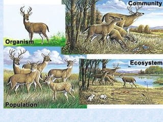 This document provides an overview of environmental science and ecosystems. It defines environmental science as the study of how humans interact with their environment, including both natural and human-made components. It then describes different types of ecosystems like forests, grasslands, deserts, freshwater, and marine environments. For each ecosystem, it outlines the key biotic components (producers, consumers, decomposers) and abiotic components. Overall, the document introduces some of the fundamental concepts of environmental science and ecology.