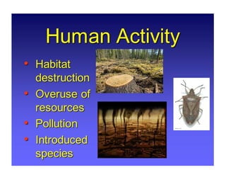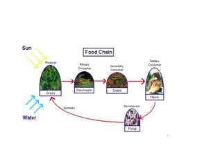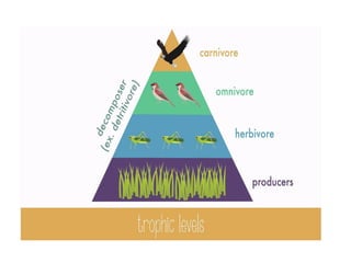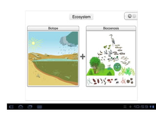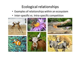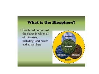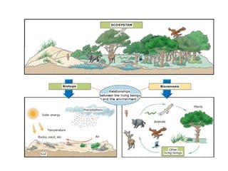 An ecosystem includes all living and non-living things in a particular area, as well as the relationships between them. It is made up of the biotope, the physical environment, and the biocenosis, which includes all living things. Within an ecosystem, populations are groups of the same species that live together, while communities are collections of different populations that live in the same area. Ecosystems can change over time due to factors like pollution, overfishing, forest fires, and deforestation.