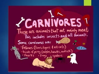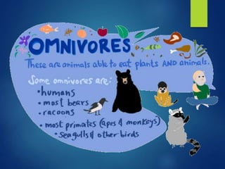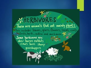 Producers like plants, algae and some bacteria capture energy from sunlight through photosynthesis. Consumers obtain energy by eating other organisms and include herbivores, carnivores, omnivores and scavengers. Decomposers break down dead organisms and return nutrients to the soil, functioning like nature's recyclers. Food chains show the transfer of energy between organisms, always beginning with a producer and ending with a consumer. Climate change can affect ecosystems by altering environmental conditions.