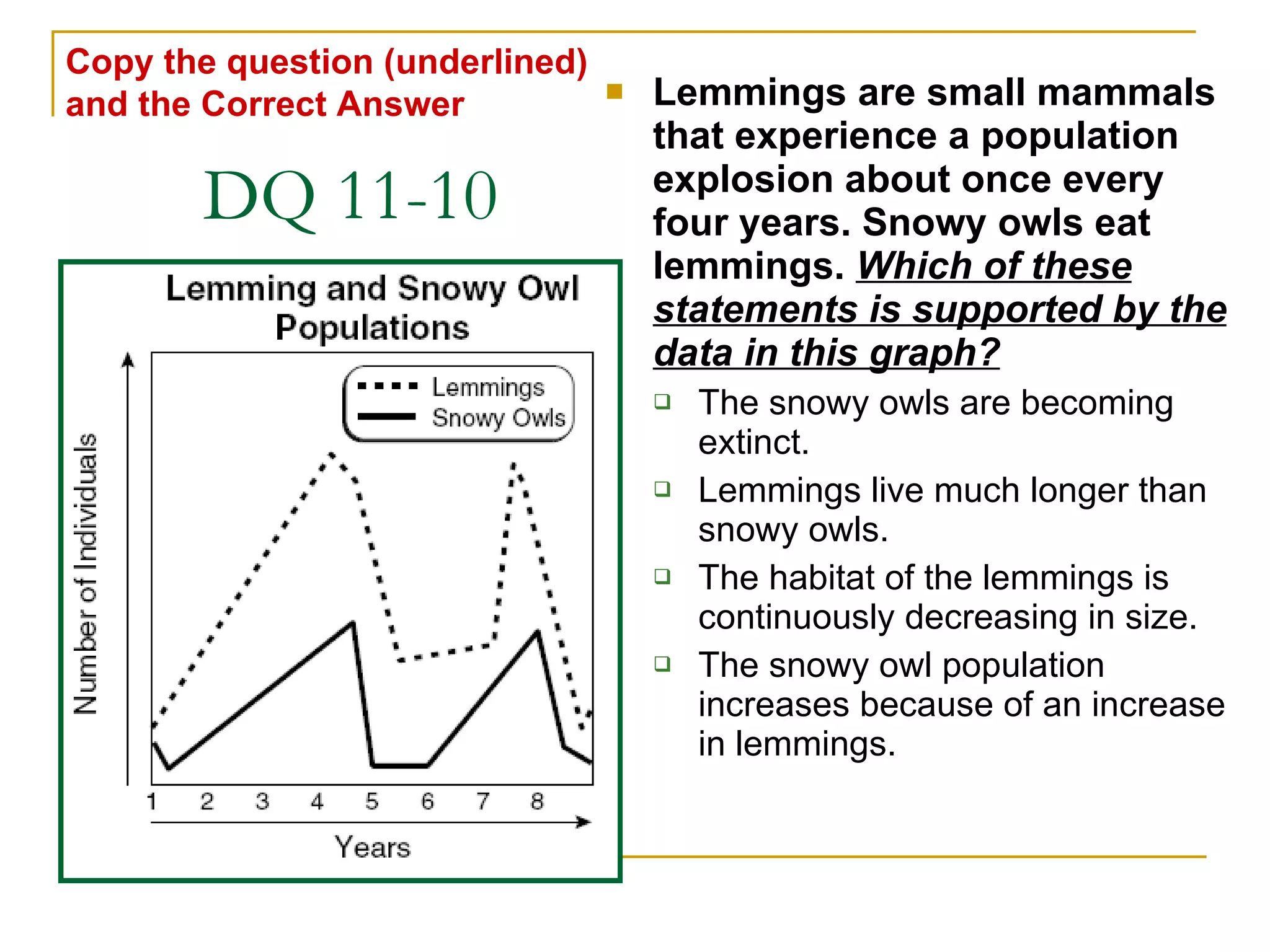 DQ 11-10 Lemmingsare small mammals that experience a population explosion about once every four years. Snowy owls eat lemmings. Which of these statements is supported by the data in this graph? The snowy owls are becoming extinct. Lemmings live much longer than snowy owls. The habitat of the lemmings is continuously decreasing in size. The snowy owl population increases because of an increase in lemmings. Copy the question (underlined) and the Correct Answer