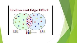 An ecotone is a transitional area between two adjacent ecological communities. It is where two communities meet and integrate. Ecotones have characteristics that are intermediate to the bordering ecosystems and often contain species found in both as well as some uniquely adapted to the ecotone. They have high biodiversity and experience an "edge effect" of even greater diversity than the surrounding ecosystems. Ecotones are dynamic boundaries that can form naturally over time or through human impacts and serve important roles as buffers, corridors for species movement, and sensitive indicators of environmental change.
