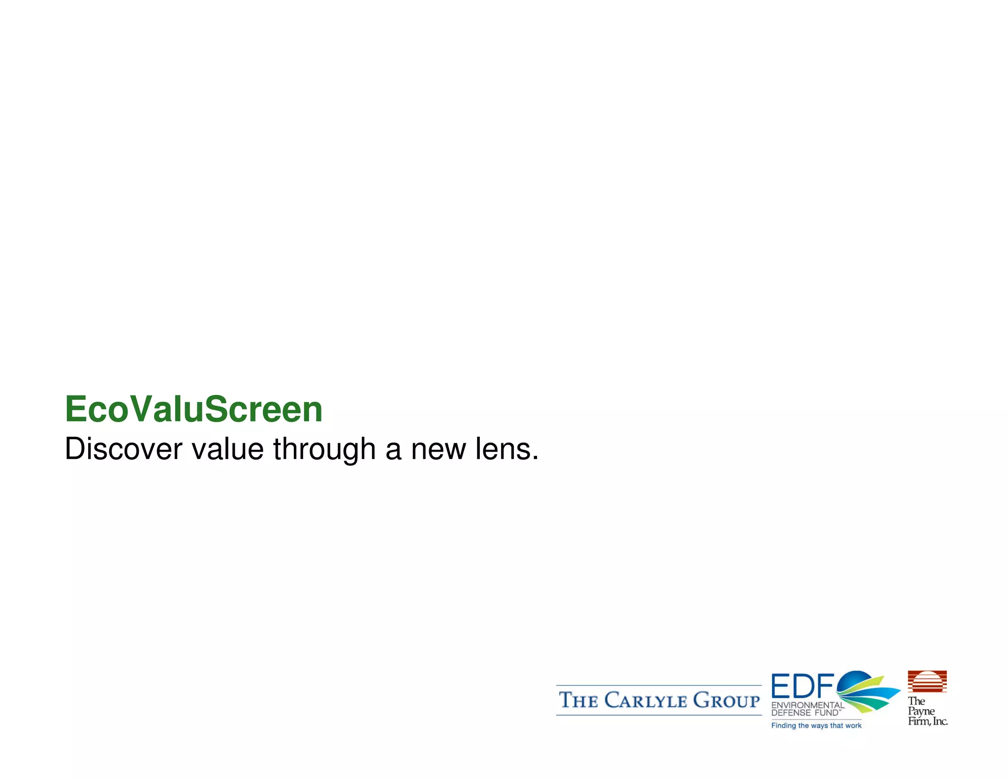 The document describes an environmental due diligence tool called the EcoValuScreen developed by The Carlyle Group, Environmental Defense Fund, and The Payne Firm. The tool is designed to help investment professionals identify opportunities to improve portfolio company operations, reduce costs, and increase value through environmental management initiatives. It involves scanning target companies for relevant business activities, identifying operational projects with environmental and financial benefits, assessing project impacts and priorities, and integrating initiatives into acquisition management plans. The goal is to expand traditional due diligence beyond risk mitigation to uncover value creation opportunities through environmental performance.