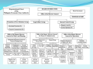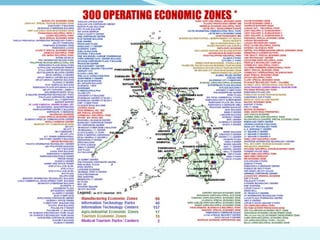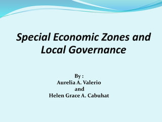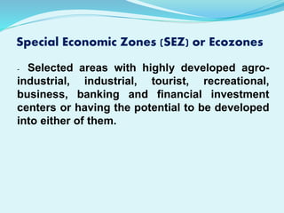 The document discusses special economic zones (SEZs) or ecozones in the Philippines. It defines ecozones as selected areas developed for agro-industrial, industrial, tourist or other business purposes. Ecozones can include industrial estates, export processing zones, and free trade zones. The Philippine Economic Zone Authority (PEZA) was established to manage ecozones and grant incentives to developers. However, tensions exist between ecozone autonomy and local autonomy regarding legal status, smuggling prevention, security, local government power, and tax exemptions. The document concludes the ecozone law needs revising to better define relationships between national, local and ecozone governance.