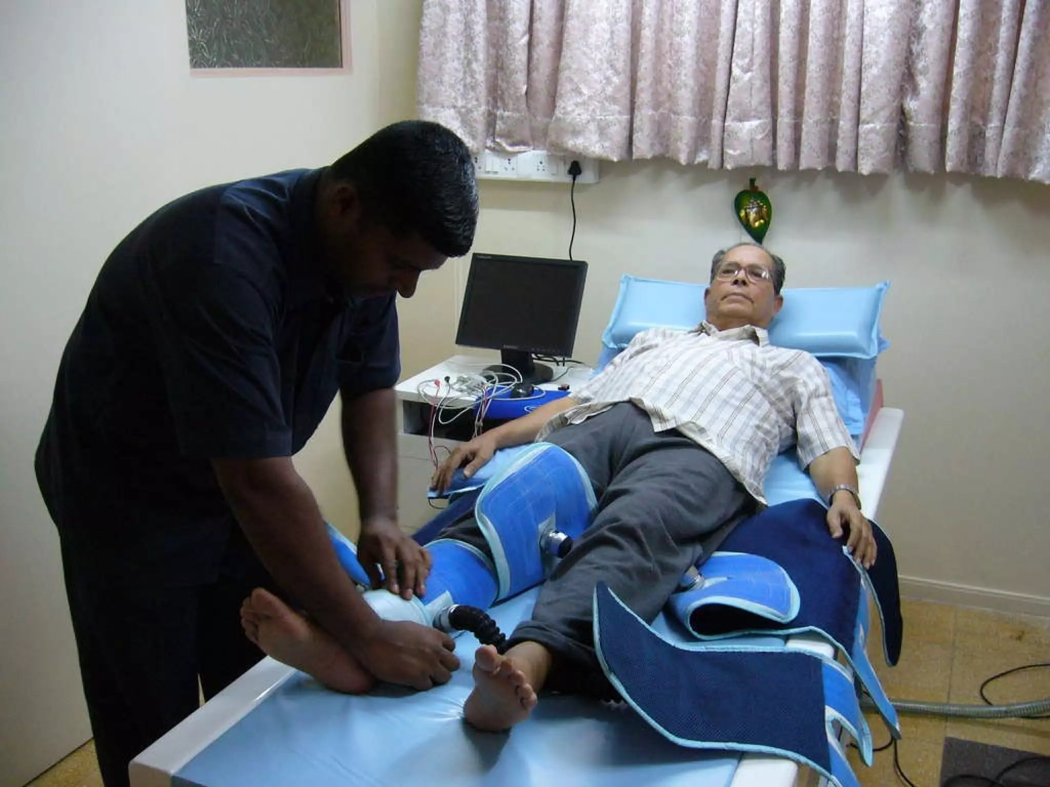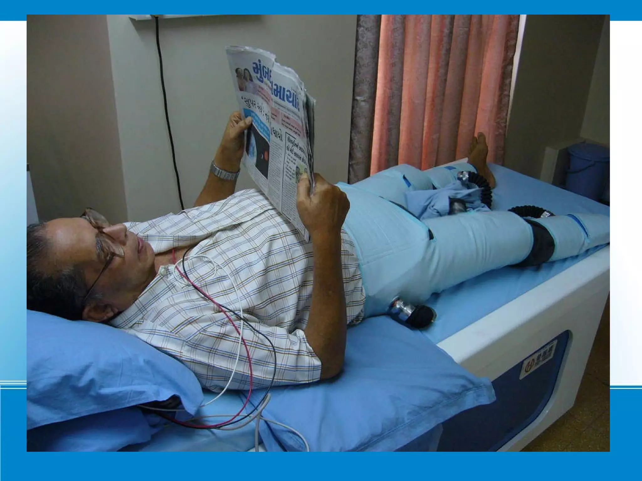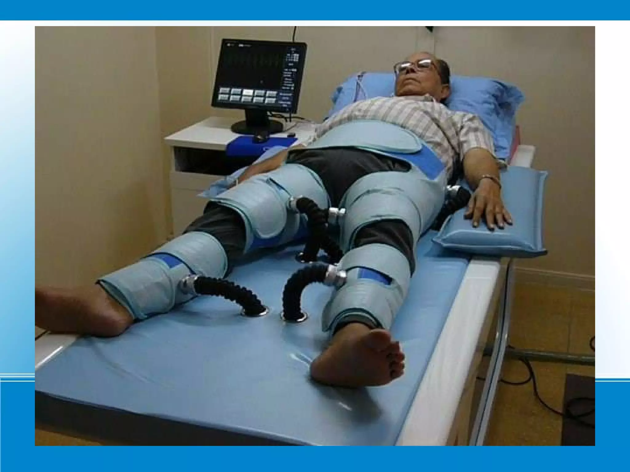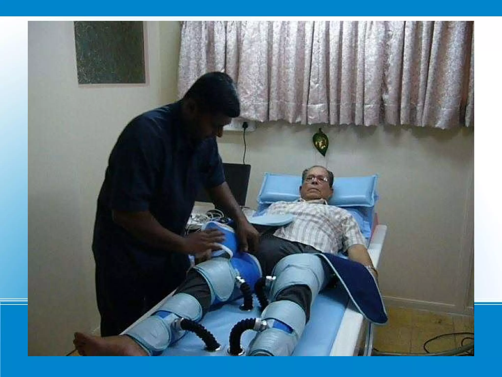 Dr. Ajay H. Kantharia is a consulting physician and cardiologist who specializes in critical care. He is the in charge of ICU and emergency medical services at Dr. Bacha's Memorial Nursing Home. The document describes external counterpulsation (ECP) therapy, a non-invasive treatment for ischemic heart disease and cardiac failure where compressed air cuffs are wrapped around a patient's calves, thighs and buttocks while they relax or engage in other activities like watching television.