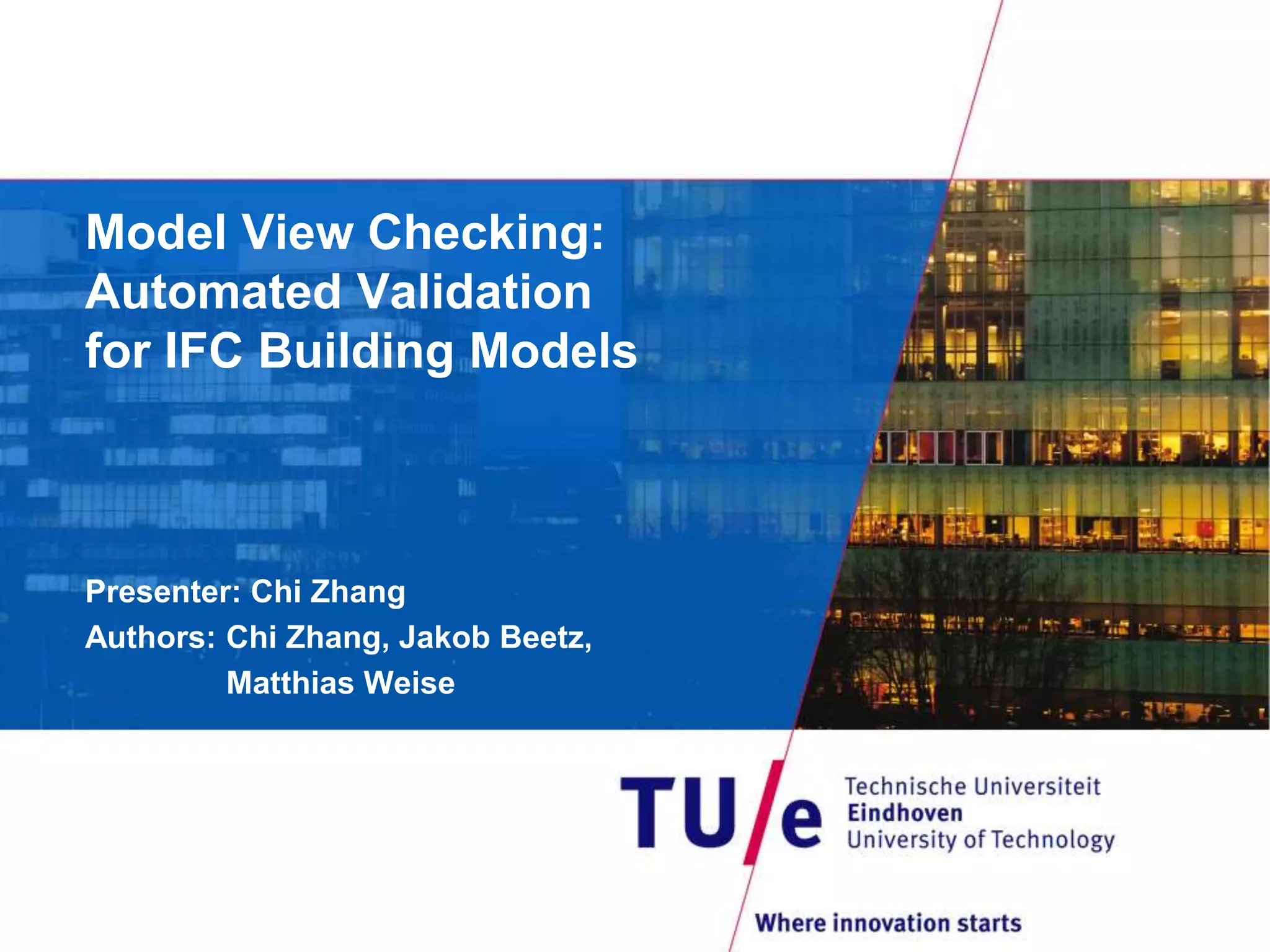 This document discusses model view checking, an automated validation method for building information models (BIMs) that uses rules to check for compliance with interoperability and exchange requirements. It presents research on developing an open-source IFC validation tool based on open standards. The tool structures rulesets using the BIM Collaboration Format and generates reports. Use cases demonstrate checking for data existence, value/type, uniqueness, and conditional rules. Ongoing work involves implementing the tool as a plugin for BIM servers and expanding the expressivity and standardization of rule libraries.
