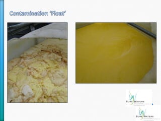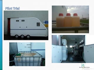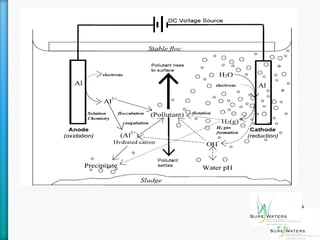 This document discusses a unique water treatment process from SureWaters that can reduce operational costs for industries. It introduces a process that can eliminate chemicals, allow for water reuse internally, and potentially create a valuable byproduct. The process involves electrocoagulation which uses sacrificial electrodes to dose water with metal ions and bubbles to cluster pollutants for removal, allowing treated water to be reused for various purposes like cooling, cleaning, and potentially making water potable again. Trial results show the process can remove over 90% of fats, oils, and grease as well as total suspended solids and reduce chemical oxygen demand. Adopting this process could significantly reduce a company's water usage and effluent disposal costs.