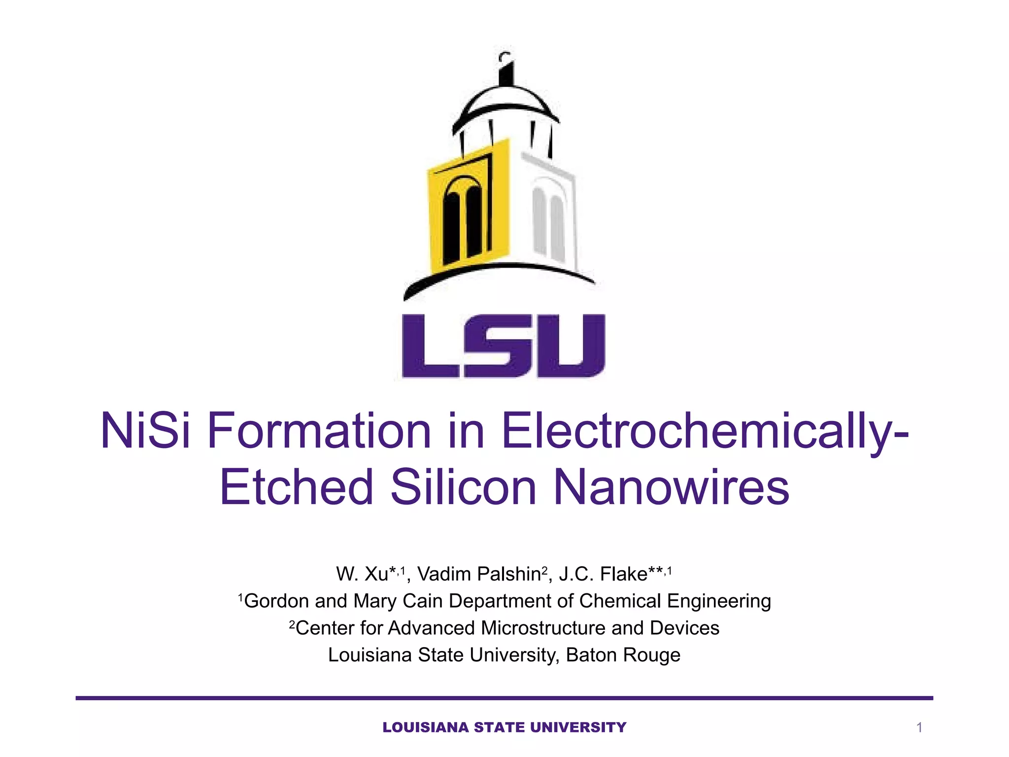 The document discusses the formation of nickel silicide (NiSi) on electrochemically etched silicon nanowires (SiNWs). Specifically, it summarizes that 1) SiNWs were fabricated via electroless etching and deposited on lithographically patterned nickel electrodes, 2) thermal annealing was used to form self-aligned NiSi contacts between the SiNWs and electrodes as evidenced by TEM, XPS and XANES characterization, and 3) electrical measurements showed ohmic behavior after silicidation, indicating lateral NiSi formation along the SiNWs.