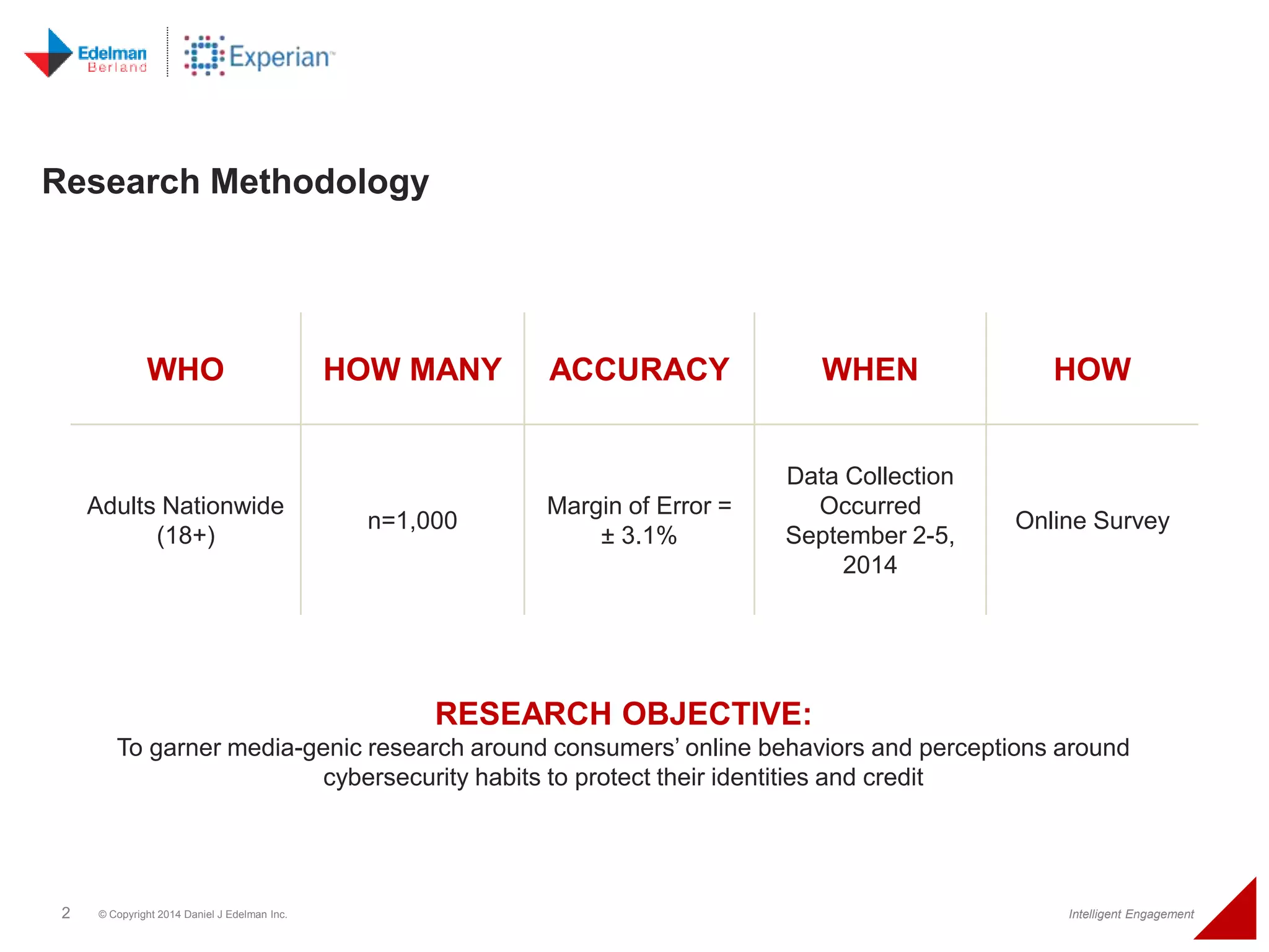 The 2014 Experian cybersecurity survey reveals significant consumer concern about identity theft, with 93% agreeing it is a growing problem. While many individuals take steps to protect their personal information, a lack of confidence remains, with 33% feeling they are not doing enough. The survey highlights disparities in consumer behavior regarding cybersecurity practices, including inadequate password protections and often ignoring privacy policies.