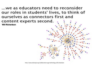 Dr. Alec Couros discusses the transformation of teaching and learning in a networked reality, highlighting the impact of Web 2.0 tools and social media on academic practices. He emphasizes the importance of building online academic identities and trust within learning networks, which can foster meaningful connections and collaboration among students and educators. The document asserts that the future of learning is open, connected, and social, reshaping how knowledge is created and shared.