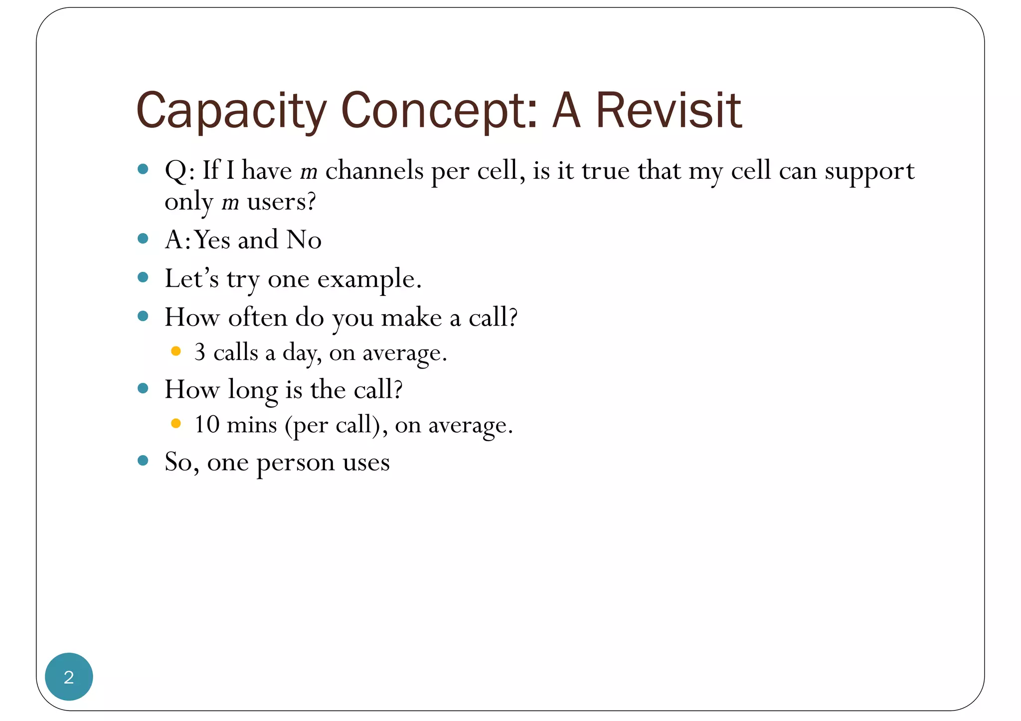 The document discusses cellular system capacity and the Erlang B formula. It provides examples of calculating the number of supported users for different channel configurations using the formula. Key points: