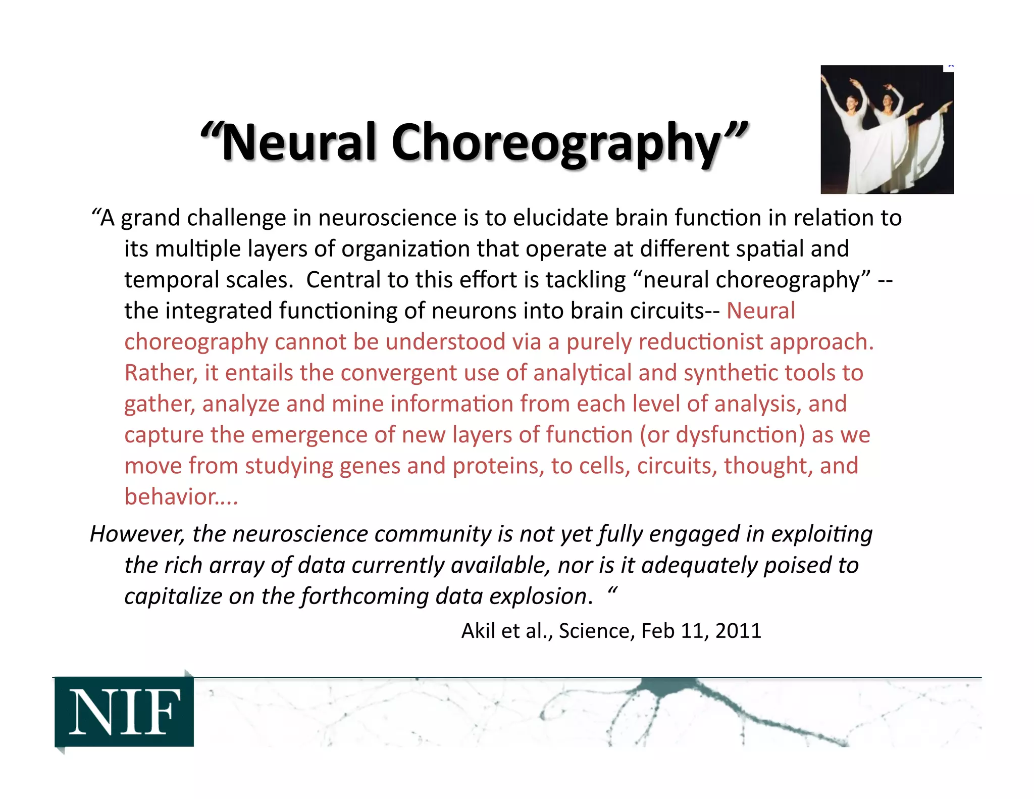 The document discusses the challenges of managing and analyzing the large amounts of neuroscience data being generated. It notes that currently, about half of researchers only store their data locally in their labs instead of in shared databases or archives. This prevents other researchers from accessing and using the data. The National Information Forum (NIF) is working to address these issues by creating a registry of neuroscience resources and developing technologies to allow researchers to discover, share, analyze and integrate data from various sources. NIF's registry currently catalogs over 6000 resources, including 2200 databases. The goal is for NIF to help the neuroscience community better exploit existing data and prepare for future increases in data.