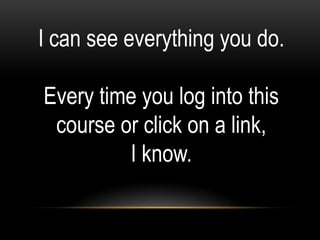 The document discusses how a user's digital fingerprint allows their online activity to be tracked. A digital fingerprint is unique to each computer and is created from factors like IP address, settings, programs used, and websites visited. This fingerprint can be used by websites, the police, and companies to identify a specific user and track their online behavior across the internet. On an online learning platform like the eLC, this means instructors can see if a user accessed assignments, forums, or videos and when they did so.