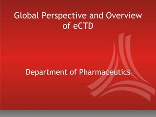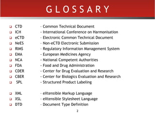 The document provides an overview of electronic Common Technical Document (eCTD) format for regulatory submissions globally. It defines key terms related to eCTD and describes the history and structure of the Common Technical Document (CTD) format adopted by the International Conference on Harmonization (ICH). The document compares paper, non-eCTD electronic and eCTD submission formats and highlights benefits of eCTD format. It also provides high-level information on eCTD fundamentals, folder structure and backbone XML view. Finally, it discusses key requirements and considerations for electronic submissions to major regulatory authorities in US, EU, Saudi Arabia, GCC countries and Health Canada.