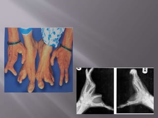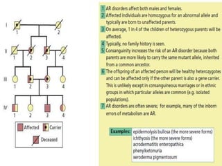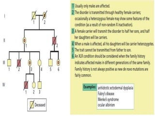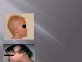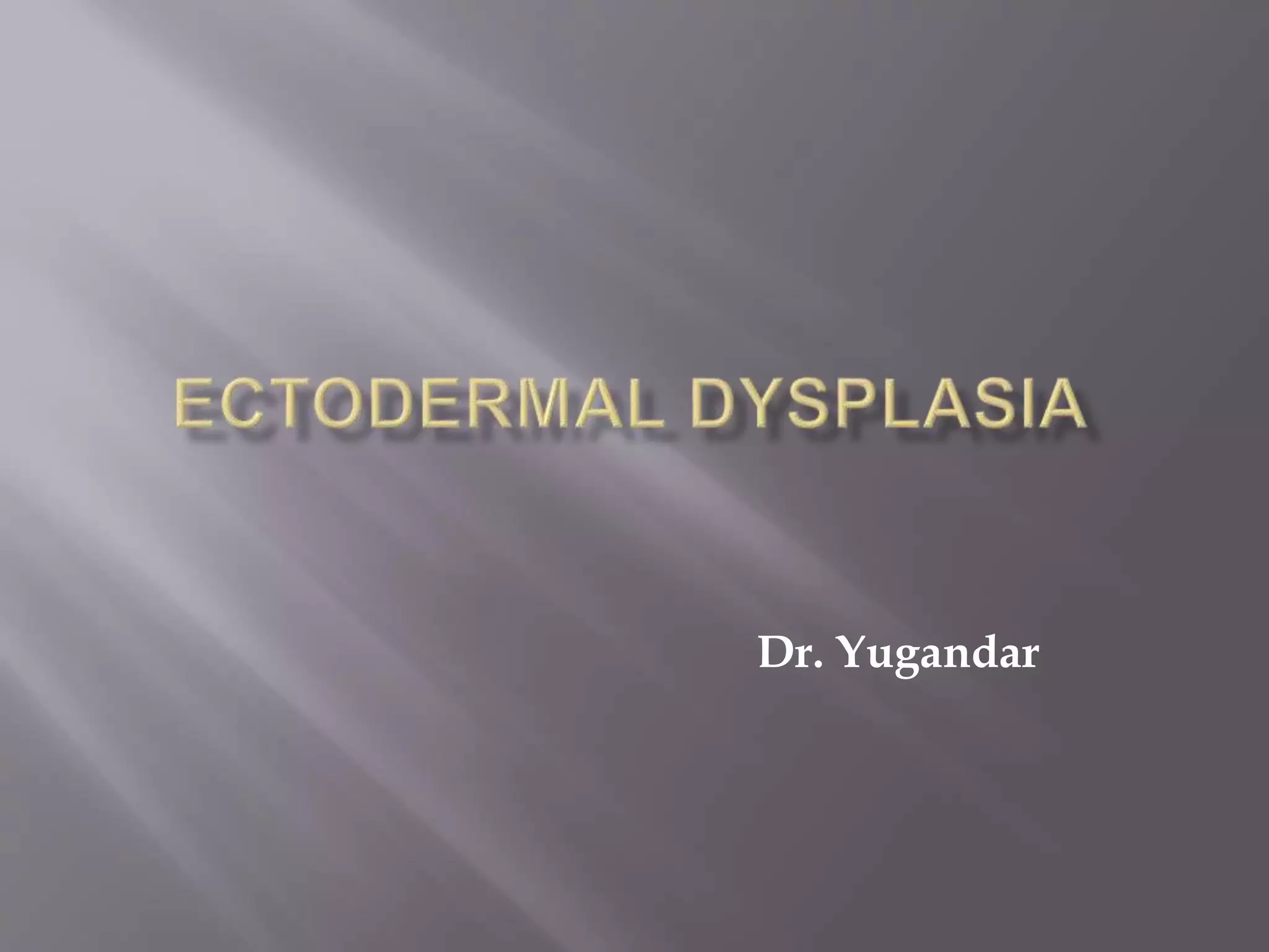 Ectodermal dysplasias (EDs) are a group of inherited disorders that affect two or more ectodermal structures such as hair, teeth, nails, and sweat glands. They are caused by genetic defects that may be inherited or occur spontaneously. EDs are classified based on clinical phenotypes and affected structures. The most common types are hypohidrotic ED (affecting hair, teeth, nails and sweat glands) and hidrotic ED (affecting hair, teeth, and nails). Without proper care, ED patients can experience life-threatening hyperthermia, infections, and failure to thrive. Treatment focuses on managing symptoms and may involve dentures, skin care, eye protection, and environmental thermal