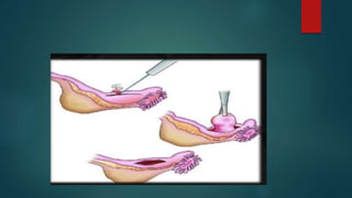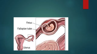 This document discusses ectopic pregnancy, which occurs when a fertilized egg implants outside the uterus, most commonly in the fallopian tubes. It defines ectopic pregnancy and outlines the various sites it can occur. It identifies risk factors like STIs, previous pelvic infections or surgeries. Signs and symptoms depend on whether the ectopic pregnancy has ruptured or not. Diagnosis involves blood tests, ultrasound and laparoscopy. Treatment options include expectant management for early, stable ectopics or surgery like salpingectomy if ruptured or unstable. The goal is to resolve the ectopic pregnancy while preserving future fertility when possible.