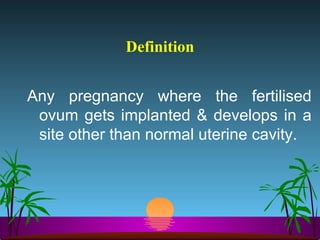 Ectopic pregnancy occurs when a fertilized egg implants outside the uterus, usually in the fallopian tubes. It is increasingly common, affecting about 1 in 100 pregnancies. Left untreated, it can cause life-threatening bleeding if the embryo implants grow large enough to rupture the fallopian tube. Diagnosis involves serial beta-hCG tests and ultrasound imaging. Treatment options include medication with methotrexate or surgery like laparoscopy or laparotomy to remove the ectopic pregnancy. With early detection and proper treatment, ruptured ectopic pregnancies can often be avoided.