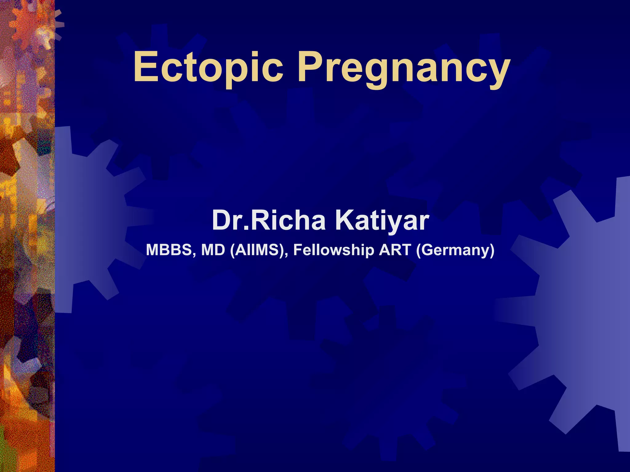 Ectopic pregnancy occurs when a fertilized egg implants outside of the uterus, most commonly in the fallopian tubes. Risk factors include prior tubal surgery, genital infections, infertility treatments, smoking, and more. Diagnosis involves evaluating symptoms, risk factors, ultrasound imaging, and beta-HCG levels. Treatment depends on whether the ectopic pregnancy has ruptured or not. Unruptured ectopic pregnancies can sometimes be treated with methotrexate or laparoscopic surgery, while ruptured ectopic pregnancies usually require emergency surgery.