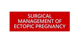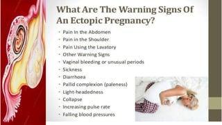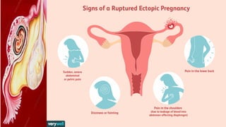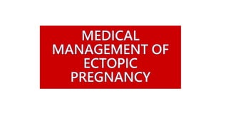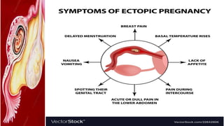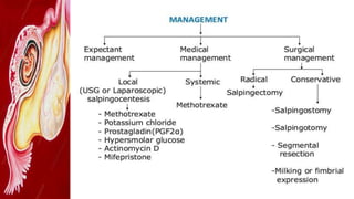Ectopic pregnancy, occurring in 1-2% of pregnancies, happens when a fertilized egg implants outside the uterus, commonly in a fallopian tube. Diagnosis involves history, blood tests, and imaging, with management options including expectant management, medical treatment with methotrexate, or laparoscopic surgery depending on the condition's specifics. Risk factors include previous ectopic pregnancies, infections, and certain reproductive health conditions.