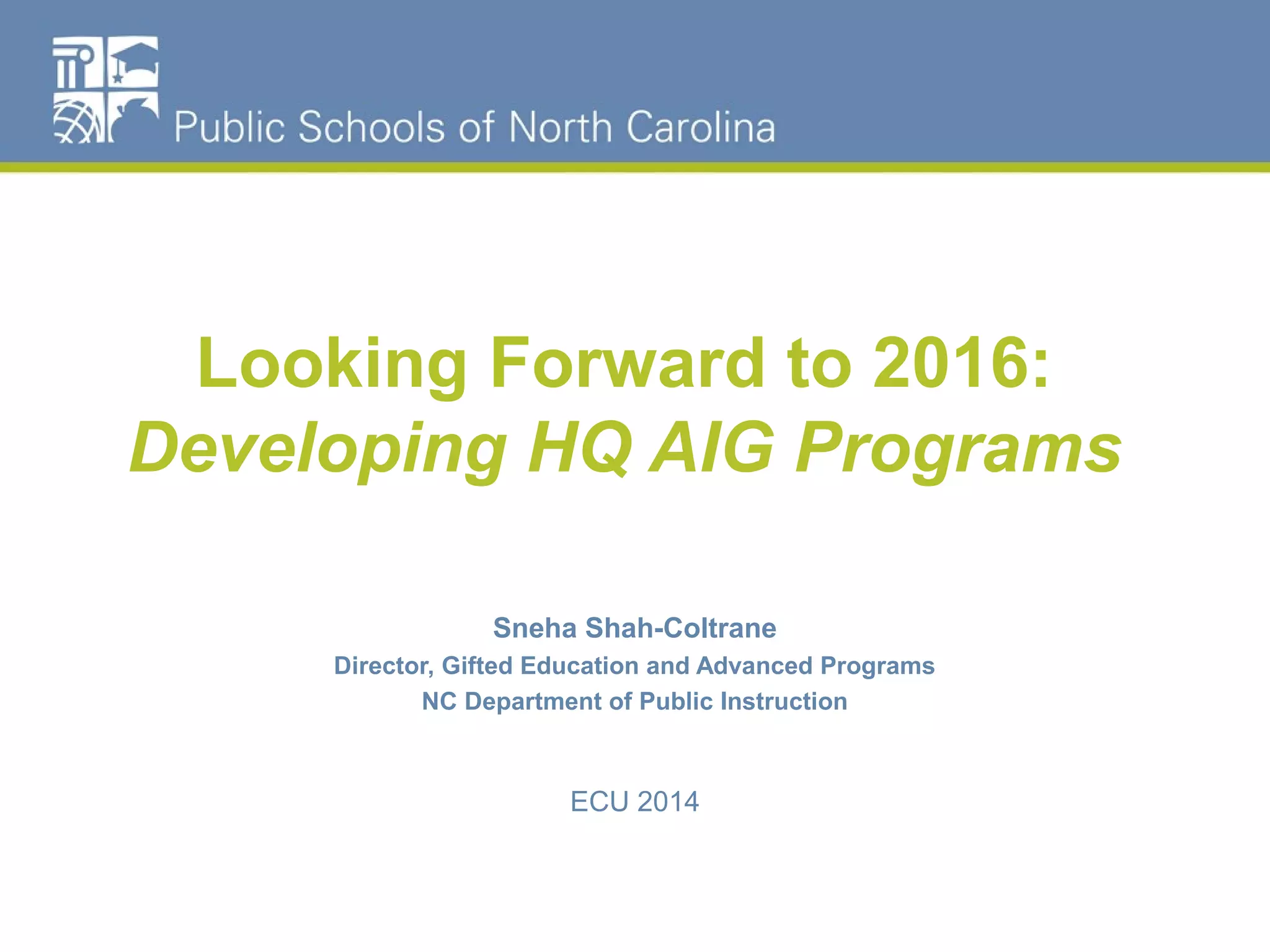 Sneha Shah-Coltrane presented on developing high quality gifted programs in North Carolina. She discussed transitioning gifted programs from the 5th generation plans focusing on revising programs to the 6th generation plans transforming programs, with 90 programs meeting standards. Looking to 2016, she wants to define what constitutes a high quality gifted program and ensure gifted education is provided all day, every day by synergizing statewide efforts to optimize the potential of all gifted learners.