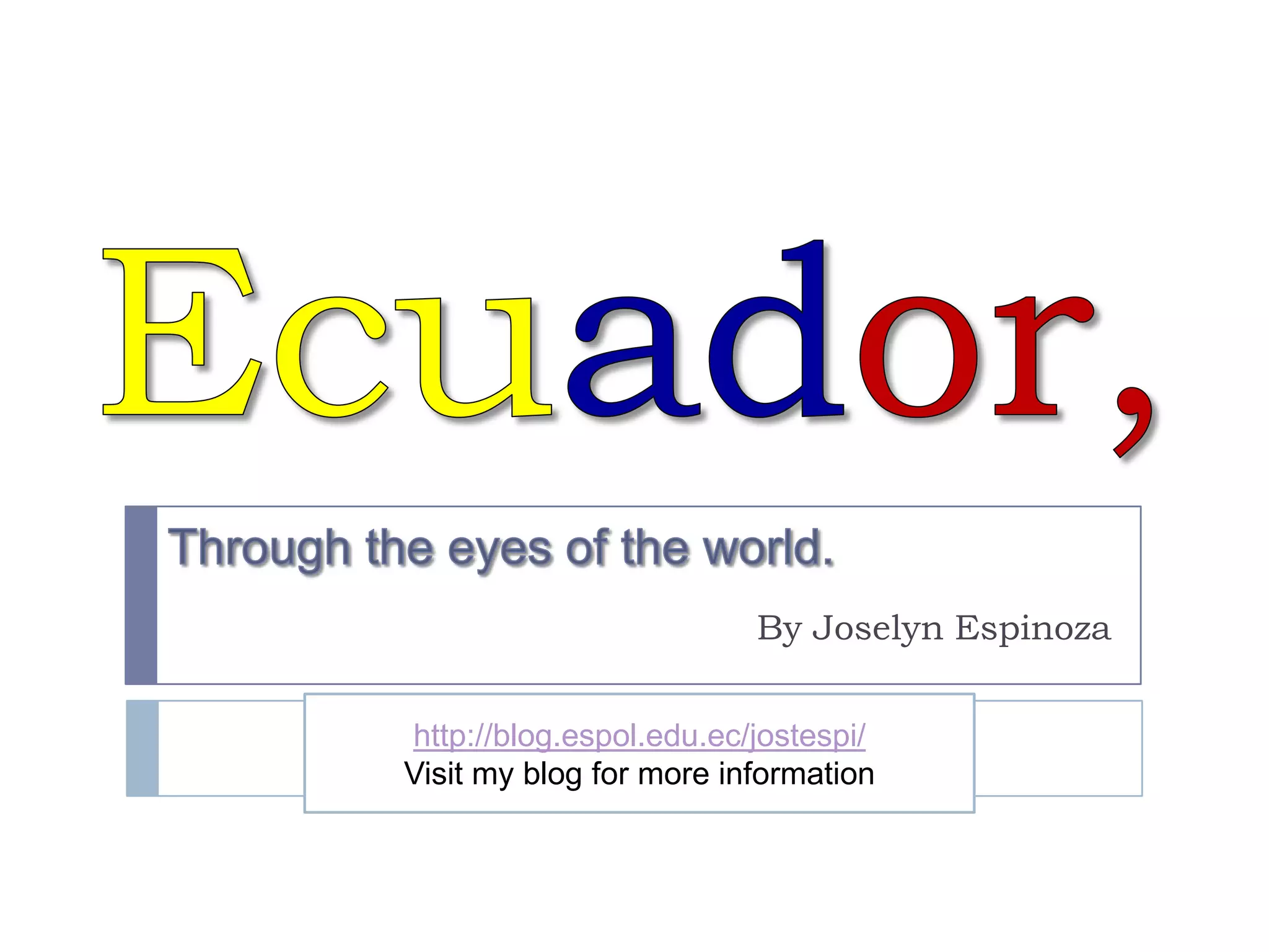 Ecuador is located in northwest South America and has diverse geography including the Pacific Coast, Andes Mountains, Amazon jungle, and Galapagos Islands. Spanish is the dominant language though indigenous languages like Quichua are also spoken. Ecuadorian culture blends Spanish and indigenous influences with mainstream culture defined by the Hispanic mestizo majority. Cuisine varies regionally with seafood popular on the coast, highland foods like pork and potatoes, and cassava a staple in the Amazon. Ecuador is predominantly Roman Catholic since the Spanish colonized and converted the country. Climate ranges from tropical on the coast and in the Amazon to varying temperatures in the highlands and islands. Ecuador has high biodiversity and is home to