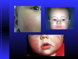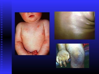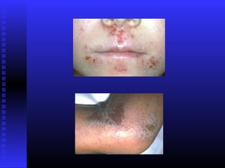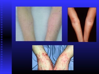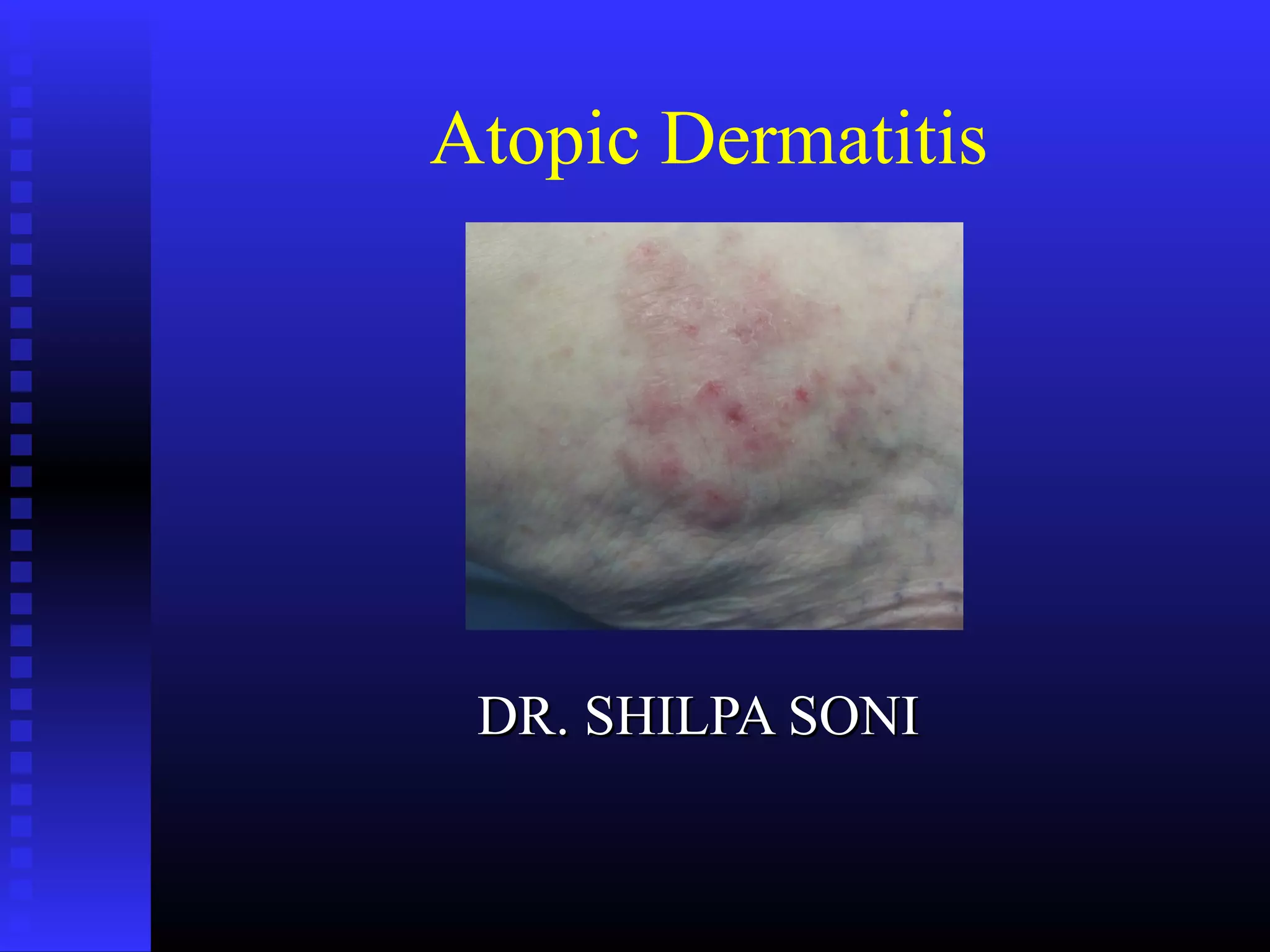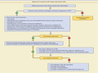 Atopic dermatitis is a chronic inflammatory skin condition characterized by dry, itchy skin and rashes. It is caused by a combination of genetic and environmental factors that damage the skin barrier. The exact cause is unknown but may involve a defective skin barrier and immune system abnormalities. Diagnosis is based on characteristic appearance and distribution of rashes as well as personal or family history of atopy. Treatment involves reducing exposure to irritants and allergens, frequent use of emollients, topical corticosteroids for flares, and immunosuppressants for severe cases.