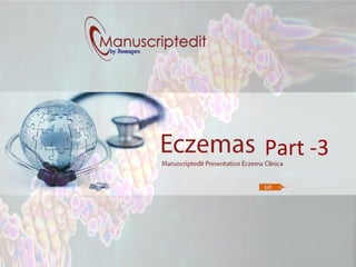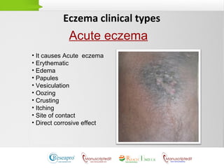 The document discusses different clinical types of eczema, including acute, sub-acute, and chronic eczema, detailing their specific symptoms. Treatment options include corticosteroids and steroid-sparing agents, with an emphasis on their application based on the extent of body surface area affected. It highlights the importance of maintaining treatment to prevent recurrence and mentions the role of emollients in specific cases.
