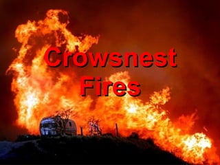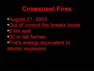A large wildfire broke out in Crowsnest, Alberta on August 21, 2003, creating a 50 meter tall wall of flames over 6 km long with energy equivalent to an atomic explosion. Local resident Elaine Hruby was evacuated from her home at 10am that day with only a few items, finding the flames engulfing Hillcrest as she witnessed the fire. While tourism declined, other local businesses were maintained, and Spray Lake Sawmills expected to salvage some burnt lumber. The fire led to increased ecological diversity as rich undergrowth developed.