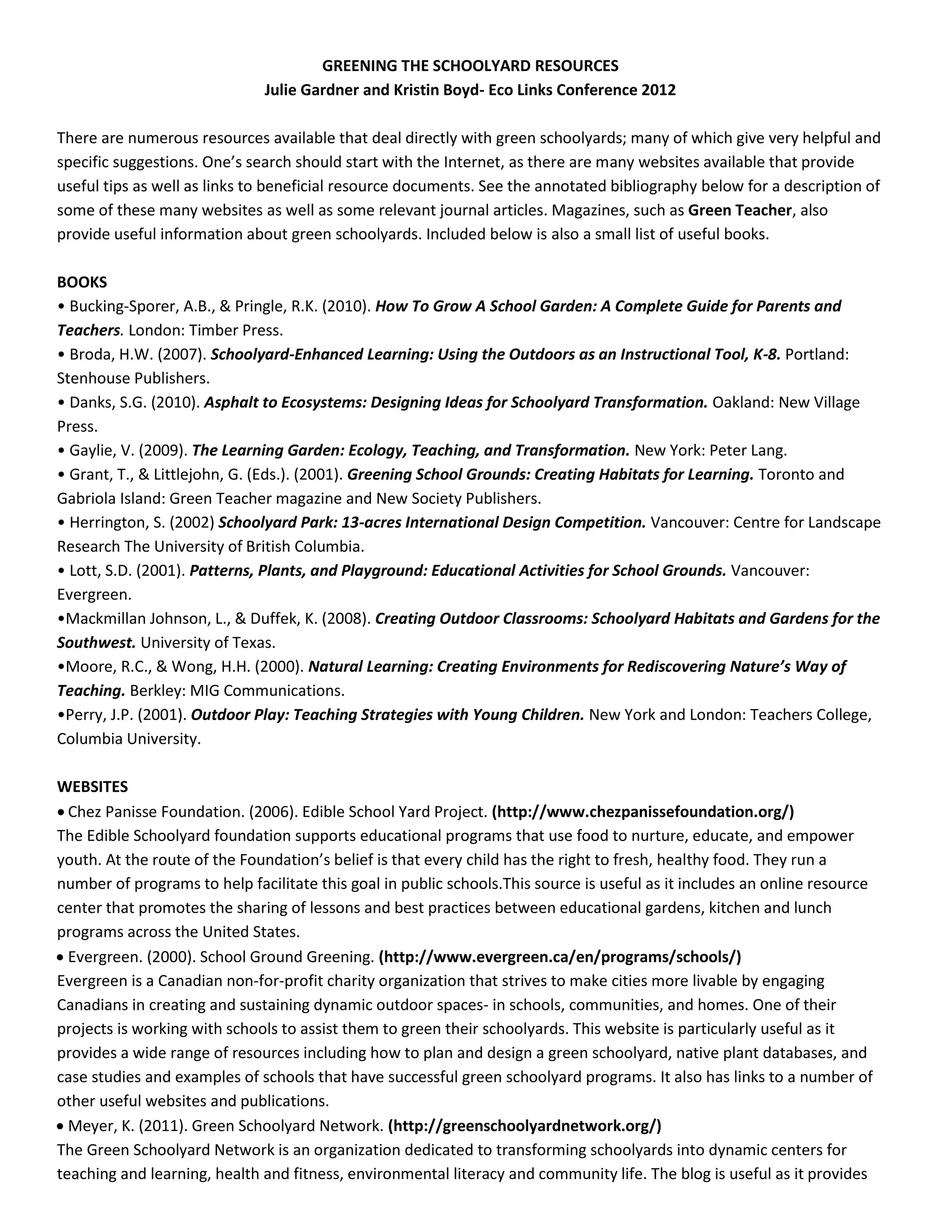 The document outlines various resources for greening schoolyards, including websites, books, and journal articles that provide guidance on creating educational outdoor environments. It emphasizes the importance of community involvement and the educational benefits of school gardens for students. The resources cover practical tips, design ideas, and case studies to assist educators in implementing green initiatives in schools.