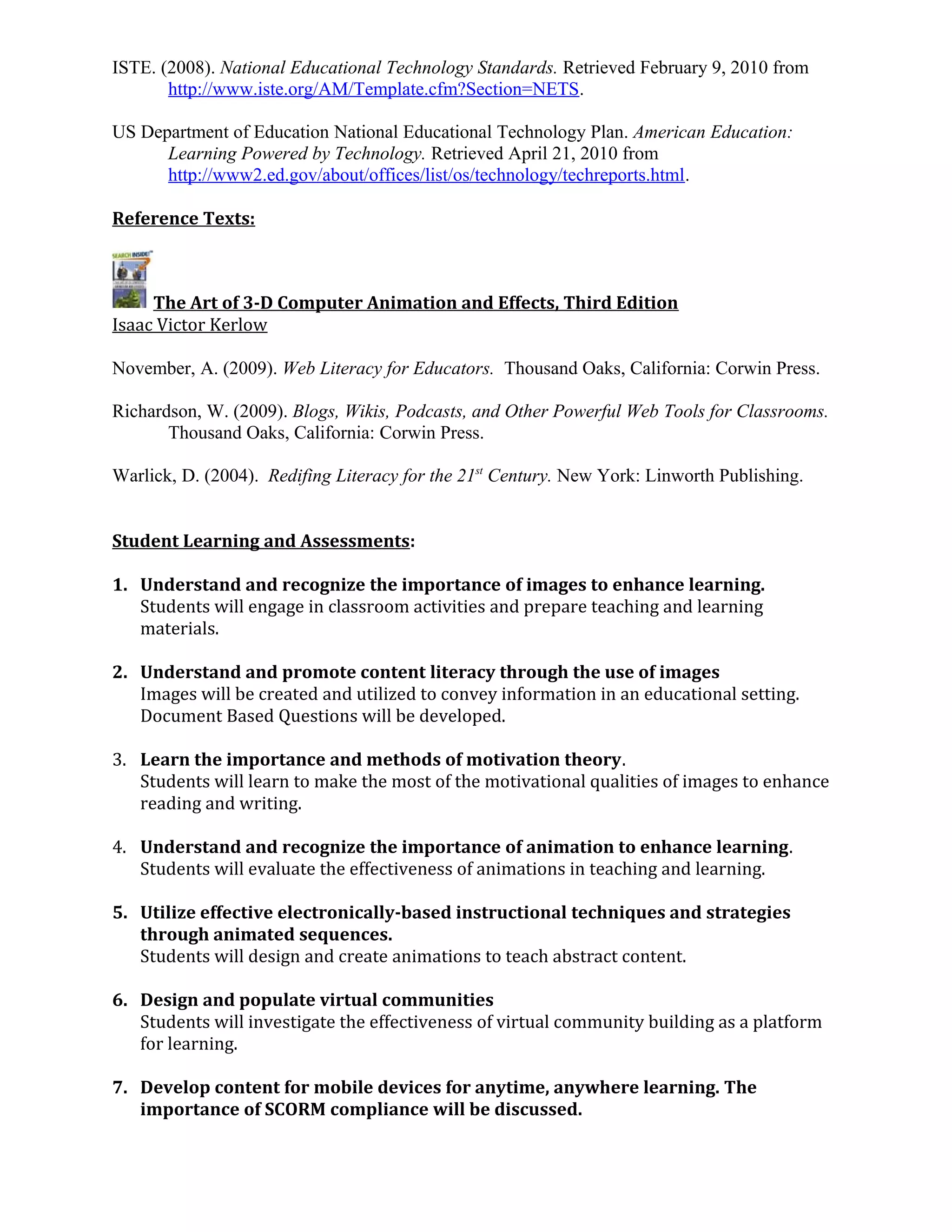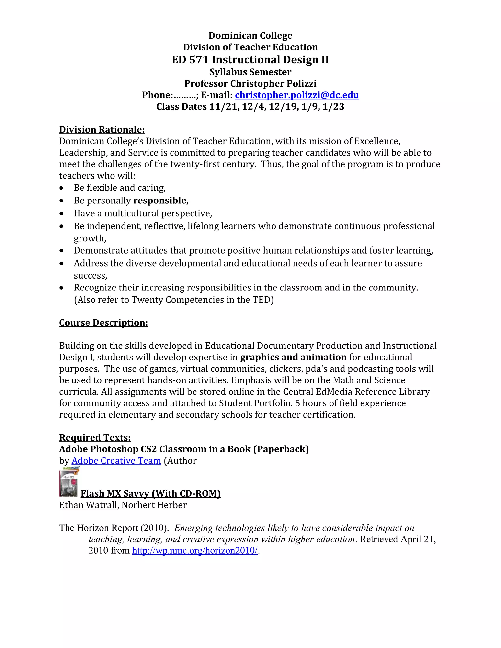 This document contains the syllabus for an instructional design course at Dominican College. The course will cover topics like using graphics, animation, games and mobile technologies for educational purposes, with a focus on math and science curricula. Students will learn skills like creating educational content and assessments using tools like Photoshop, Flash, podcasting and virtual learning communities. The course consists of 5 sessions held between November and January, with assignments due at the end of each session.