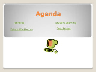 The document discusses the benefits of investing in educational technology. It argues that technology can increase student learning as measured by higher test scores, help develop skills needed for future jobs, and better engage students. Technology is seen as crucial for preparing students and school districts for the 21st century workforce.