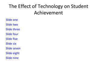 Alfred Odden presented on the effect of technology on student achievement. He discussed how technology has moved beyond chalk and boards and engages students through individualized learning. A study showed students in technology-integrated classrooms had higher graduation rates, comprehension, and college attendance compared to non-technology classrooms. While technology can help most students, there are still access issues for some groups. Teachers need proper training and technology purchases require careful planning to avoid pitfalls.