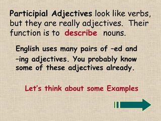 This document discusses participial adjectives ending in -ed and -ing. It explains that these words look like verbs but function as adjectives to describe nouns. It provides many examples of common -ed and -ing adjective pairs and explains that -ed adjectives describe how a person feels while -ing adjectives describe personality, places, events, or experiences. The document encourages practicing distinguishing between -ed and -ing forms through example sentences.