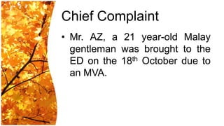 1) Mr. AZ, a 21-year-old man, was brought to the ED after a motorbike accident with open fractures of his left forearm bones and bilateral lung contusions.