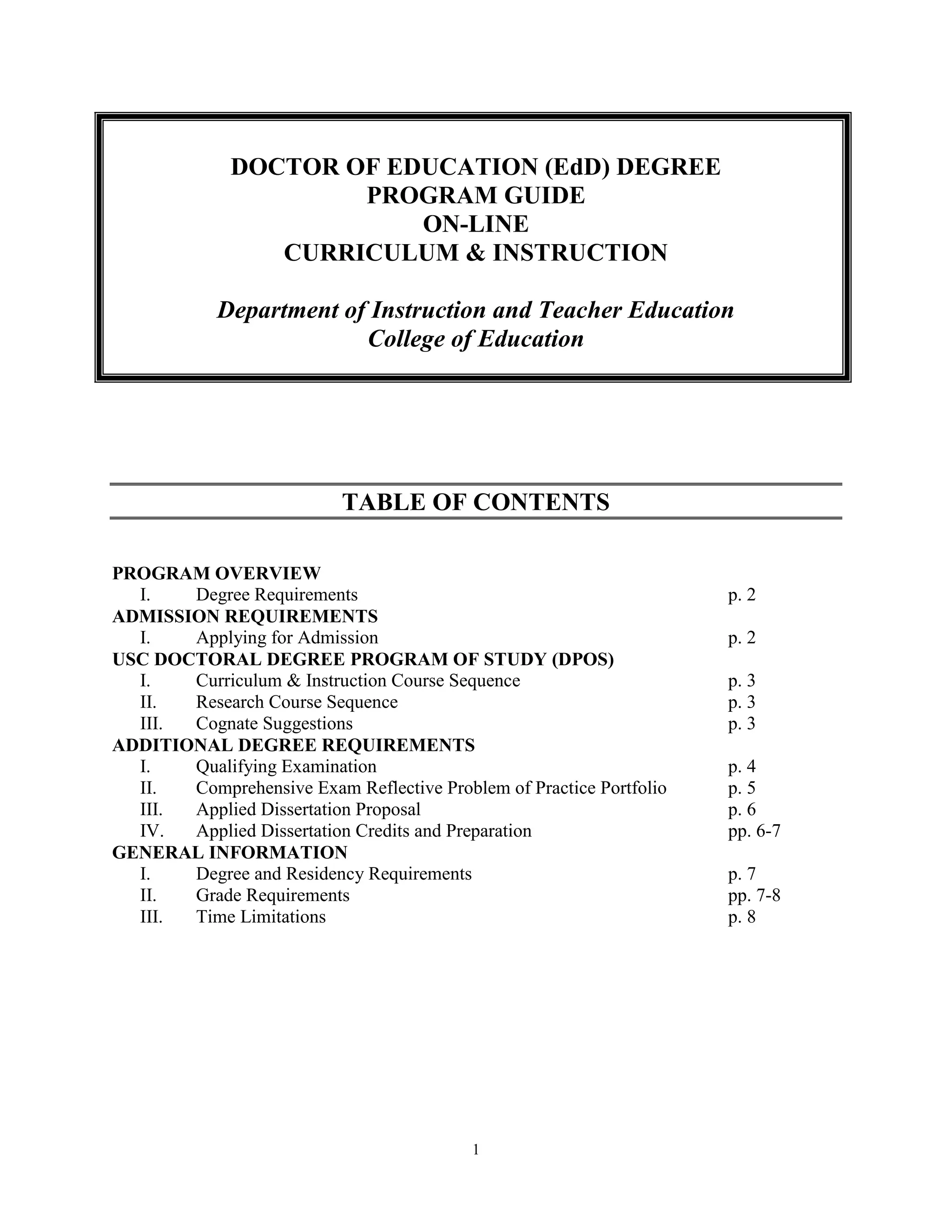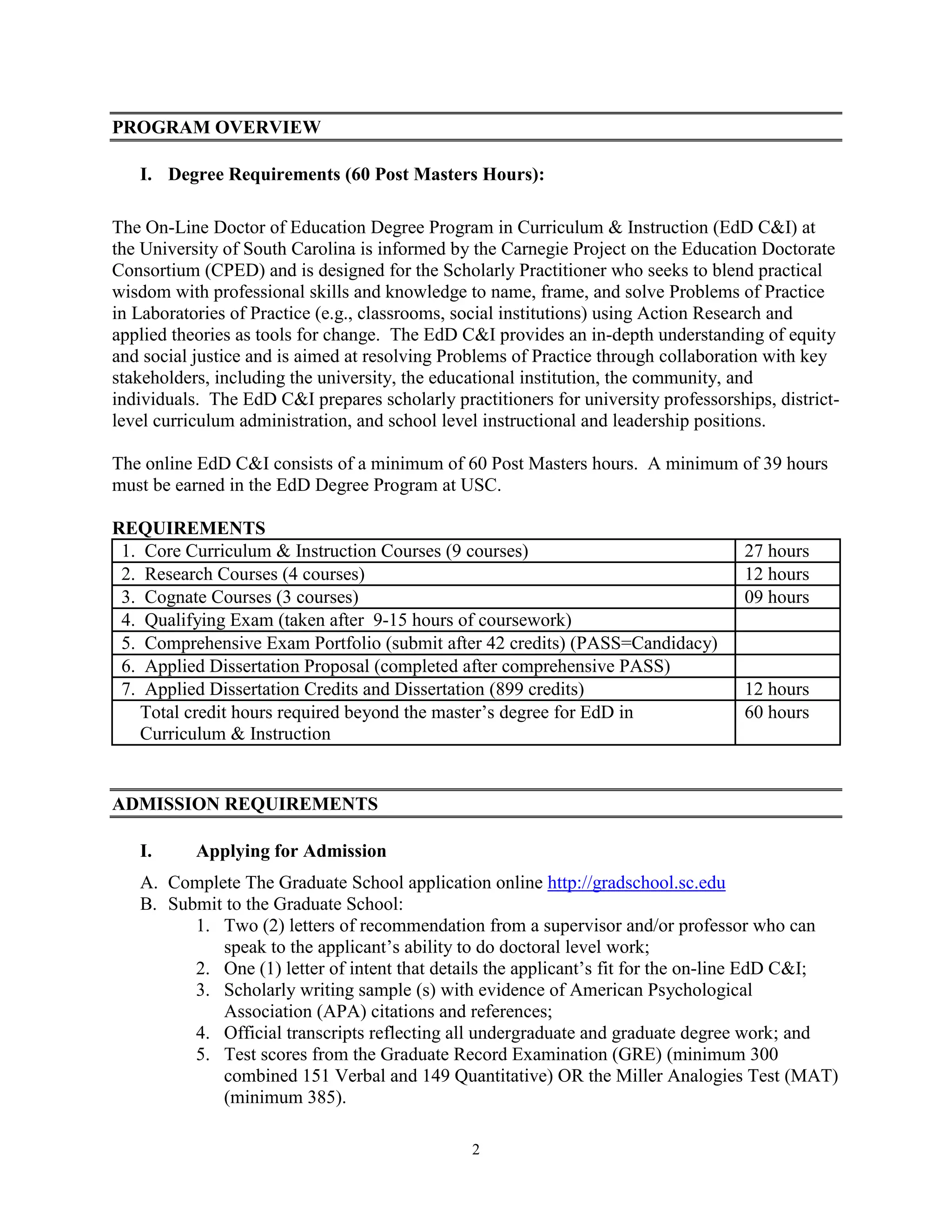 This document provides an overview and requirements for the online Doctor of Education (EdD) degree program in Curriculum & Instruction at the University of South Carolina.