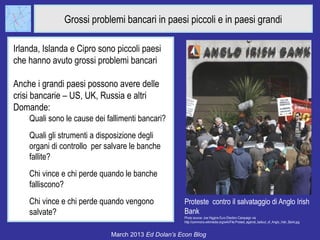 Questo documento è un slideshow educativo che esplora le cause e le conseguenze dei fallimenti bancari e dei salvataggi, analizzando il bilancio di una banca e il concetto di insolvenza. Viene discusso il pericolo delle 'banche zombie', le corse agli sportelli e gli strumenti di ristrutturazione governativa, inclusi prestiti d'emergenza e iniezioni di capitale. La conclusione sottolinea che i costi delle perdite bancarie devono sempre essere sostenuti da qualcuno, sia esso il governo o i contribuenti.